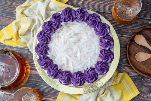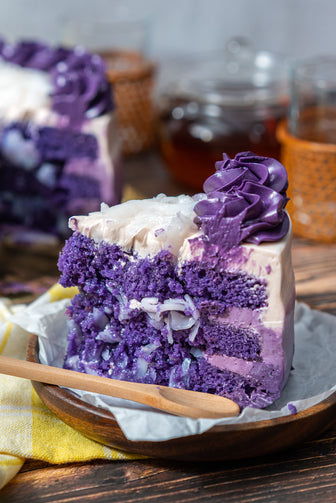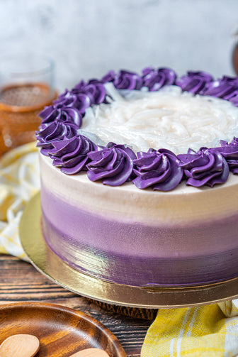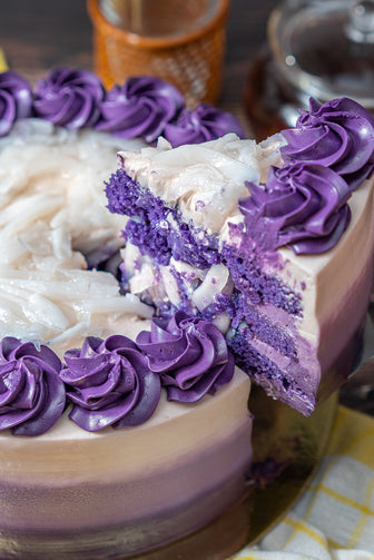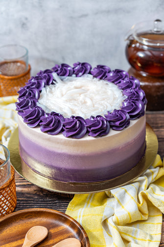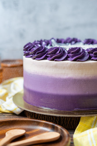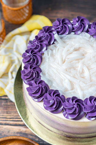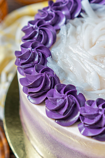 Light ube chiffon cake filled with macapuno and ube buttercream frosting.